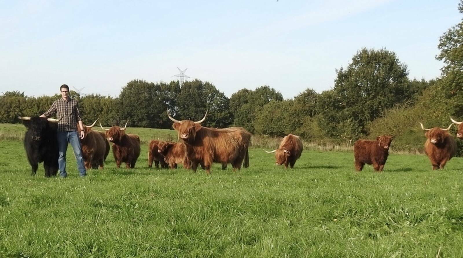 Von Anfang an lag mir die artgerechte und ursprüngliche Haltung am Herzen. Da das Hochlandrind aus den rauen Highlands Schottlands stammt, fühlt es sich ganzjährig im Freien mit Abstand am wohlsten. Die Herde lebt in Mutterkuhhaltung. Das bedeutet, dass die Kälber neun Monate bei ihren Müttern bleiben. Alle Kälber werden im Frühjahr geboren und leben dann erst einmal gemeinsam mit den anderen Kälbern und Mutterkühen auf einer Weide.